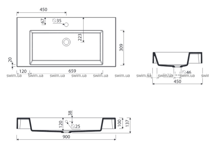 - Габаритные размеры раковины: 900x450x137 мм