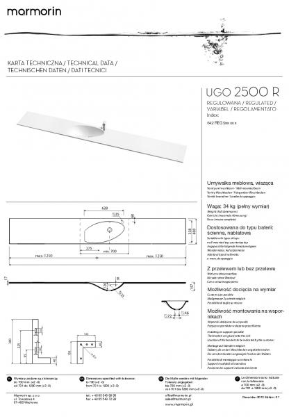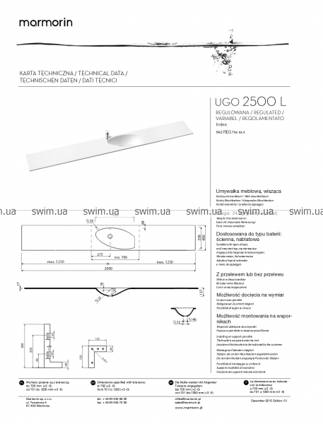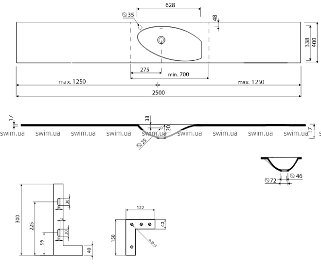 - Габаритные размеры раковины: макс. 2500 / мин. 700х400х137 мм