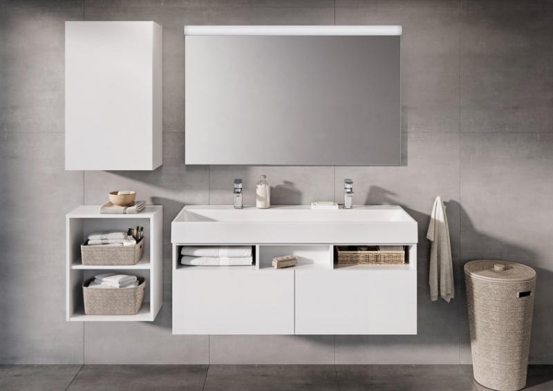 Двойной умывальник привносит в ванную комнату новое ощущение пространства. Единое пространство легче содержать в чистоте, а для стока воды вполне хватает одного слива.