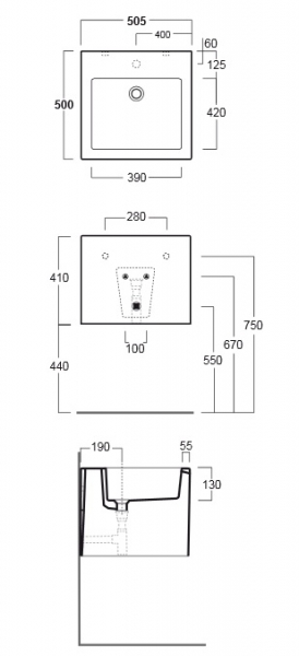 - Без отверстия под смеситель, с 1 намеченным отверстием под смеситель