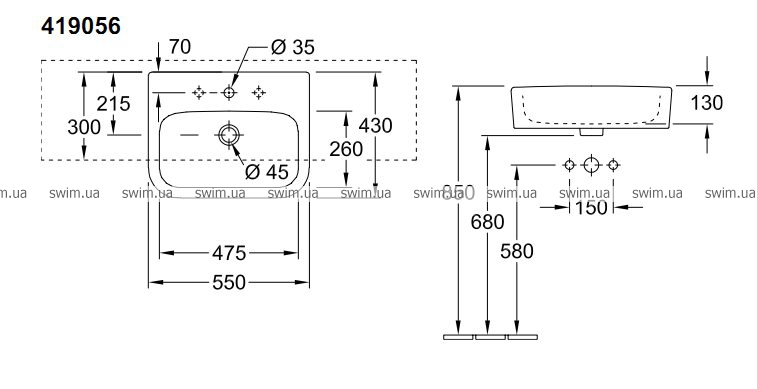 - Тип смесителя/отверстие для смесителя: для 3-позиционного смесителя, центральное отверстие для смесителя выбито