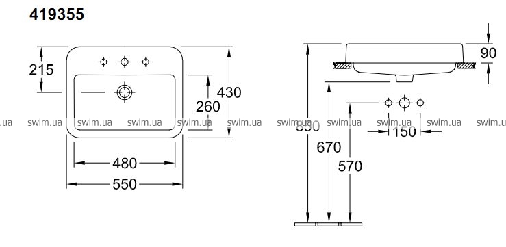 - Тип смесителя/отверстие для смесителя: для 3-позиционного смесителя, центральное отверстие для смесителя выбито