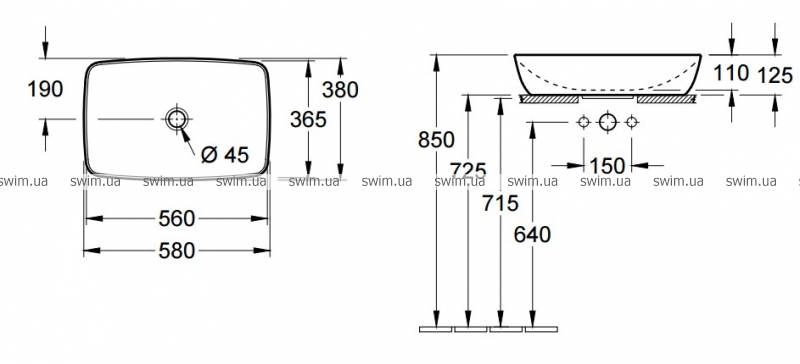 - отверстие под смеситель: для смесителей на высокой ножке или смесителей с креплением на стену, без зоны для отверстий для монтажа смесителя
