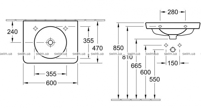 - отверстие под смеситель: отверстие для смесителя выбито справа, слева отверстие для смесителя подготовлено к выбиванию (например для дозатора жидкого мыла)