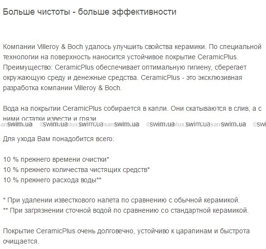 ***CeramicPlus По специальной технологии на поверхность наносится устойчивое покрытие CeramicPlus. Преимущество: CeramicPlus обеспечивает оптимальную гигиену, сберегает окружающую среду и денежные средства. CeramicPlus - это эксклюзивная разработка компании Villeroy & Boch.