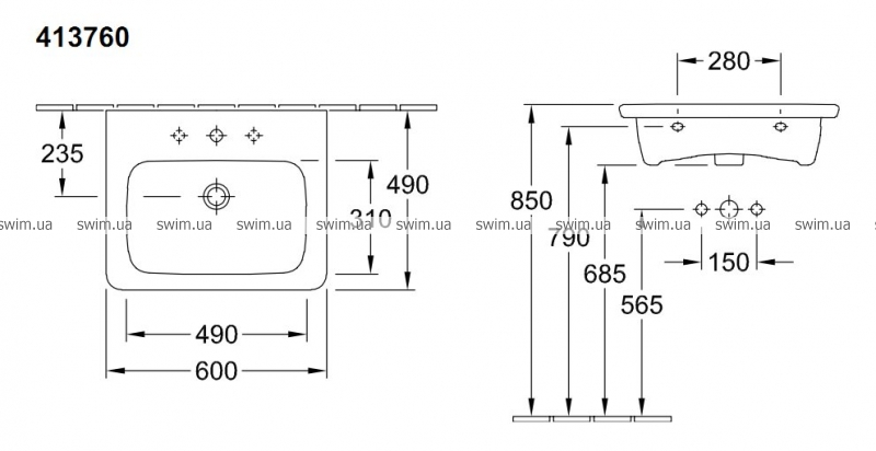 - Тип смесителя/отверстие для смесителя: для 3-позиционного смесителя, центральное отверстие для смесителя выбито