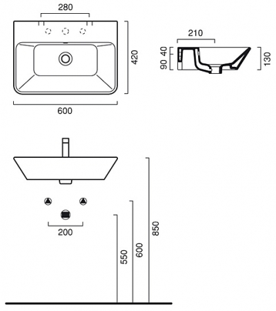 • Отверстие под смеситель: 1, намеченных -2 отверстия