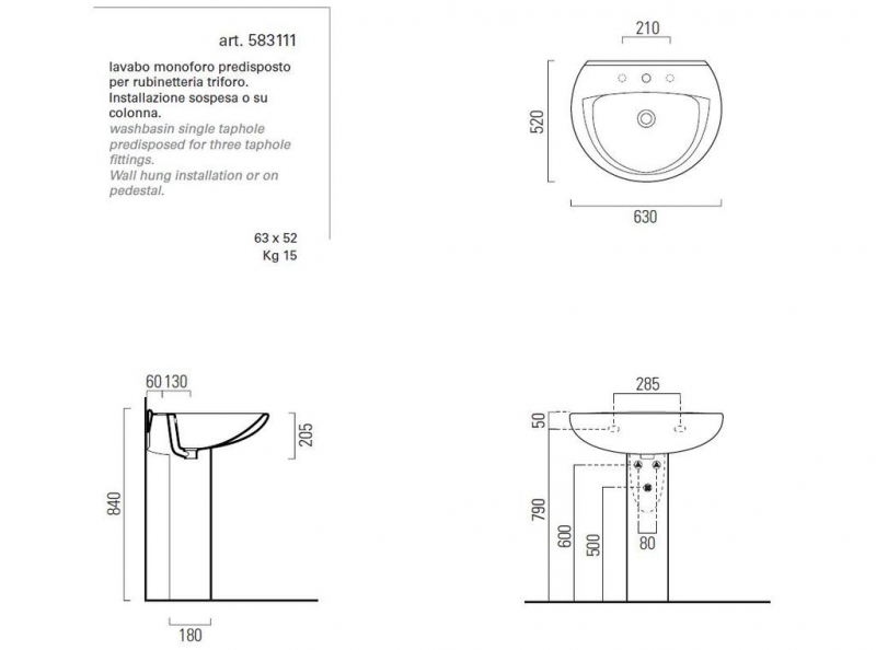 Умывальник 63 см с одним отверстием для смесителя (предусмотрены три отверстия). Установка - подвесная или на колонне, полуколонне (крепление для полуколонны FCOLONNA).