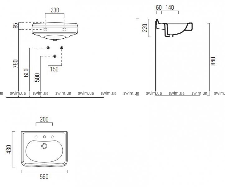 Умывальник 56 с одним отверстием для смесителя (предусмотрены три отверстия). Установка - подвесная.
