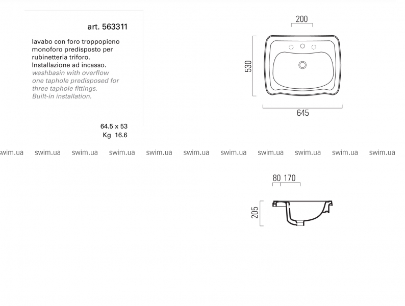 Умывальник с одним отверстием для смесителя (предусмотрены три отверстия). Установка - встроенная в столеницу.