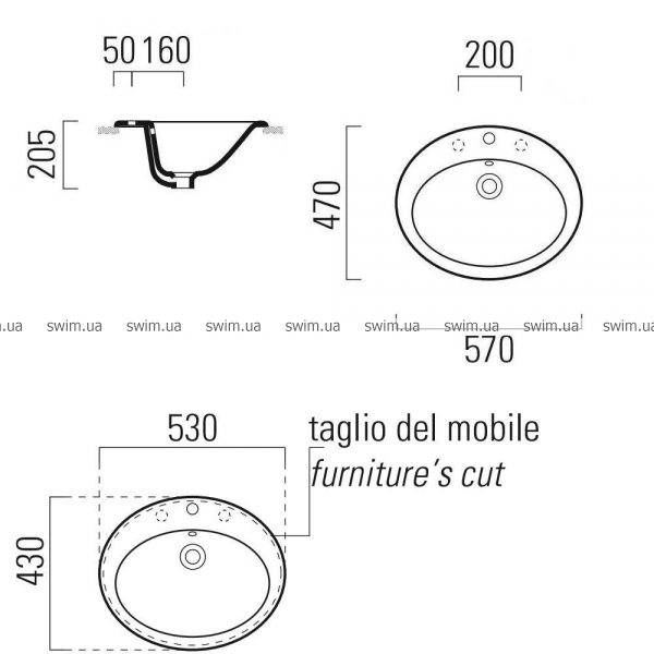 Умывальник "Ализео" с одним отверстием для смесителя (предусмотрены три отверстия). Установка - встроенная в столешницу.
