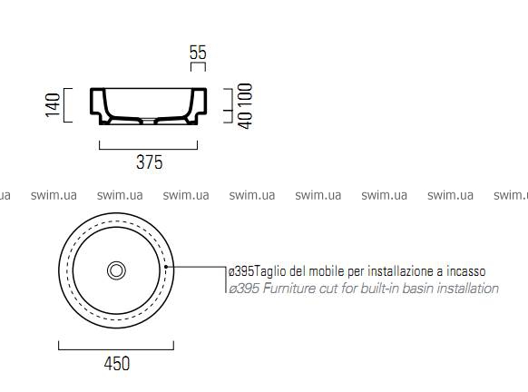 Умывальник Ø45 без перелива, предназначена для смесителя со стены или со столешницы. Установка - накладная или встроенная.