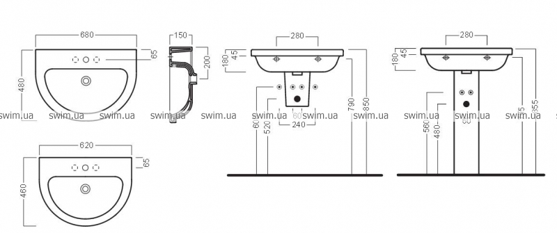 Раковина для пристенного монтажа. С полуколонной (YXBK), колонной (YXHE) или с открытым сифоном.