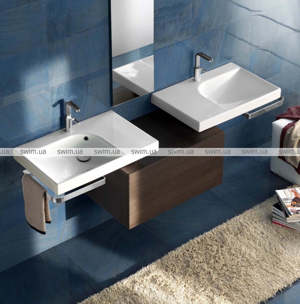 Подвесной настенный умывальник 75x50 см правосторонний. Комбинируется с керамическими правыми и левыми полками GRANDANGOLO 50, вешалками для полотенец и сифоном в эстетическом исполнении.