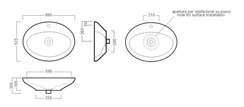 Накладной умывальник 70 см. Укомплектован сливом свободного типа со специальной хромированной пробкой. Без перелива.