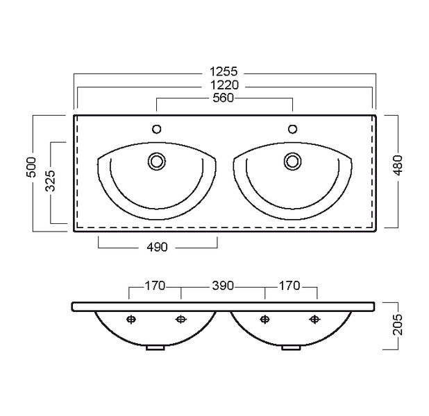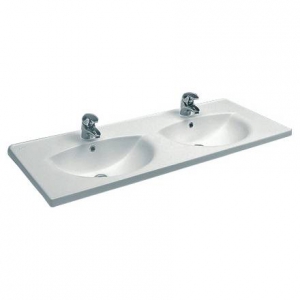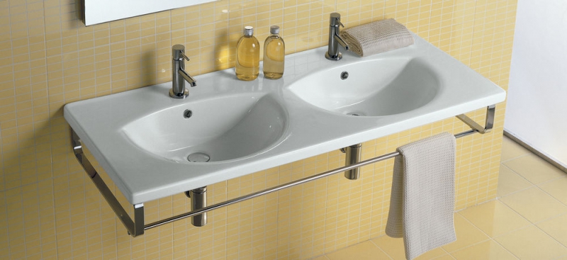 Раковина с двумя чашами и двумя смесителями на одно отверстие. Крепится на стену или устанавливается на мебель. Крепеж раковины (YR47) приобретается отдельно. Может комплектоваться стальным полотенцедержателем.