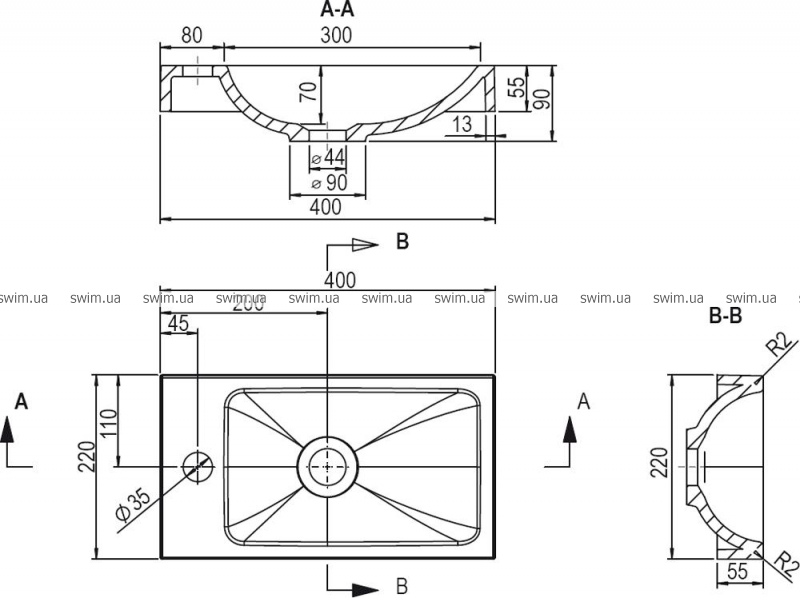 - Умывальники поставляются только с отверстием 35 мм под смеситель.