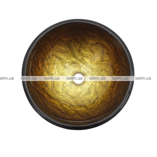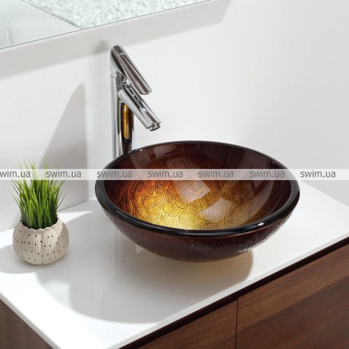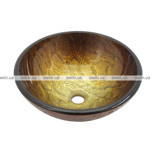- Чаша абстрактной текстуры с цветовым градиент от золота до глубокого янтарного, что делает эту раковину привлекательным дополнением к любому интерьеру ванной