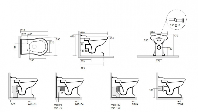 - Слив может быть как вертикальным в пол при помощи отводов 900102, 900104, 7619, так и горизонтальным в стену при помощи отвода 7539