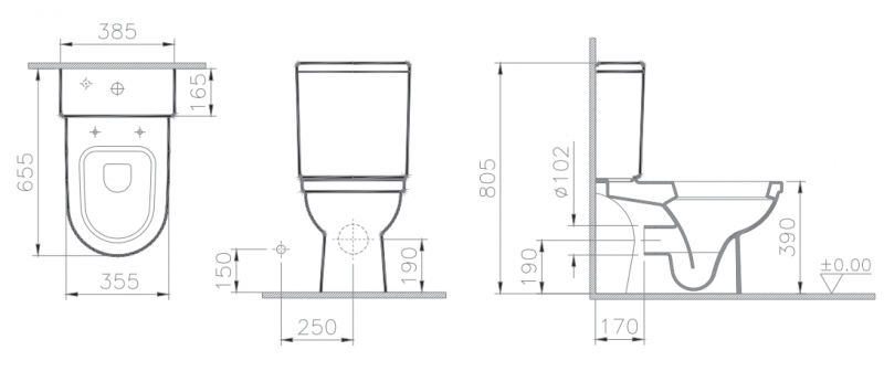 Моноблочный унитаз с универсальным выходом слива, арматура в бачке 3/6 л