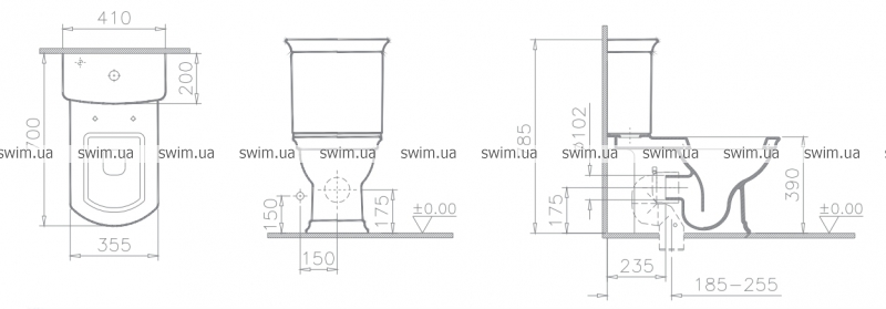 Моноблочный унитаз с универсальным выходом слива, арматура в бачке 3/6 л