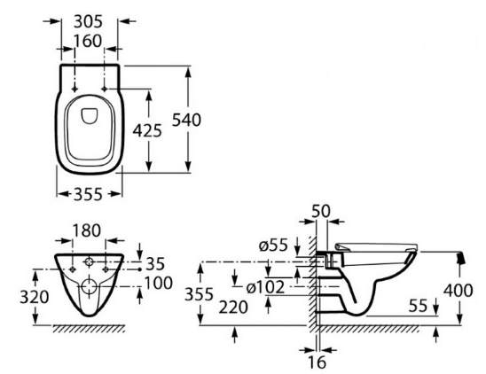 - Габариты унитаза (ВхШхГ): 34.5 x 35.5 x 54 см