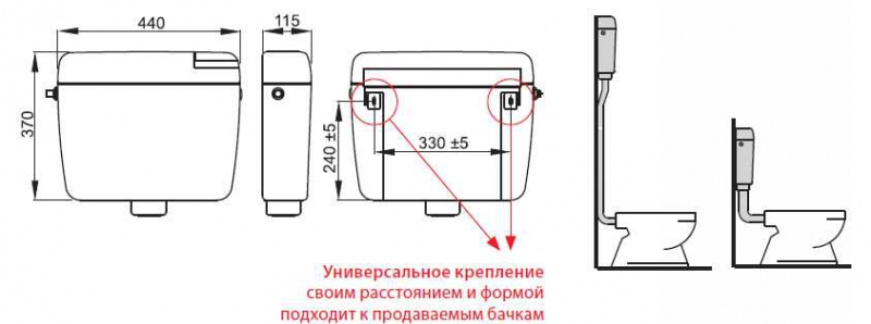 - Универсальное крепление: своим расстоянием и формой подходит к продаваемым бачкам