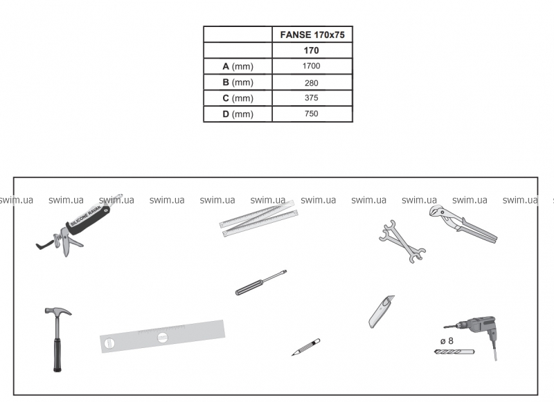 - Додаткові комплектуючі: опора 75U, сифон для ванни, фронтальна панель U 170 см та бічна панель U 75 см. Ванну можна доповнити шторкою та змішувачем для ванни на вибір із нашого асортименту