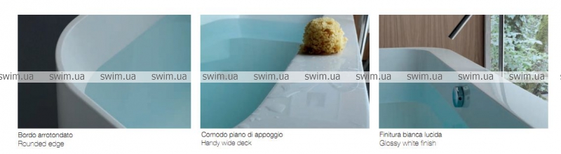 Глянцевая отделка. Хромированный донный клапан. Встроенный слив-перелив. Регулируемые ножки. Тонкий край обода всего 25 мм. Ремонтный комплект, доступный при любых графических или случайных повреждениях.