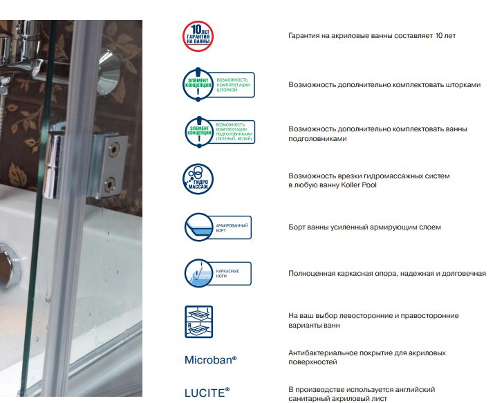 Используемый материал для производства ванн Koller Pool – литьевой акрил (полиметилметакрилат) производства известной торговой марки Lucite® с применением антибактериальной технологии Microban. Толщина акрилового листа для прямоугольных ванн 4 мм, для угловых и ассиметричных ванн 5 мм.