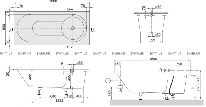 - комплект ножек для ванны (самоклеящихся) входит в поставку, регулируются от 130 - 180 мм