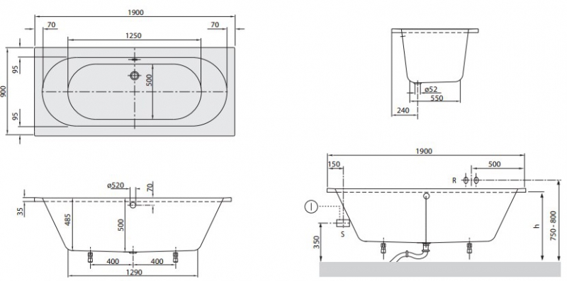 ГоловнаВанниVilleroy&Boch → Ванна акриловая Villeroy&Boch O.Novo UBA190CAS2V-XX 190х90 см