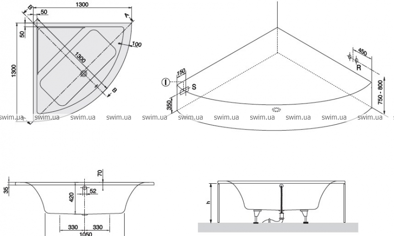 - комплект ножек для ванны не входит в стандартную поставку, необходим удлиненный слив/перелив