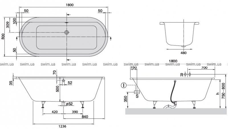 - комплект ножек для ванны не входит в стандартную поставку, необходим удлиненный слив/ перелив