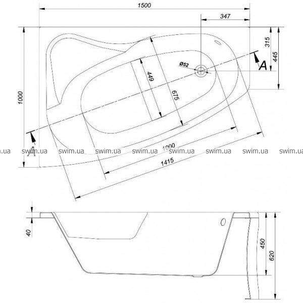 - Розташування зливного отвору з коротшої сторони, бічний злив