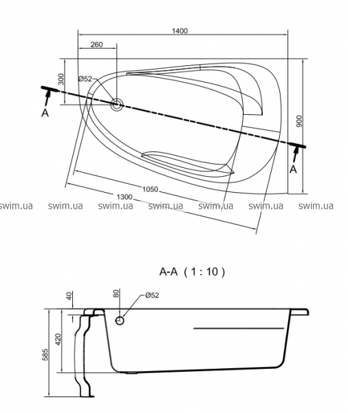 - Розташування зливного отвору з довшої сторони, бічний злив