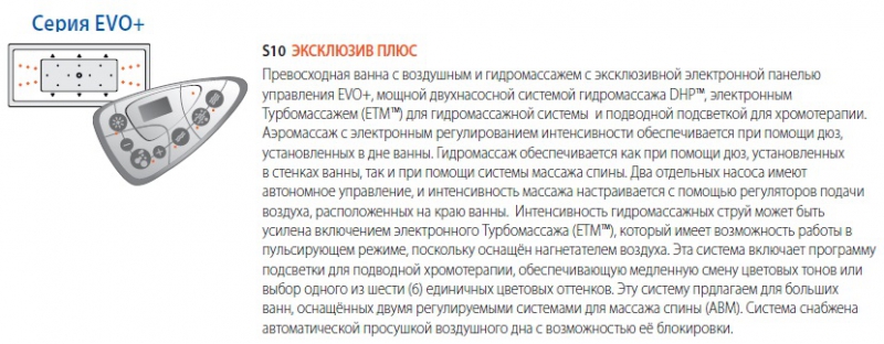 - Аеро- та гідромасажна ванна з двома насосами (DHP™), електронним турбомасажем (ETM™) та панеллю керування EVO+