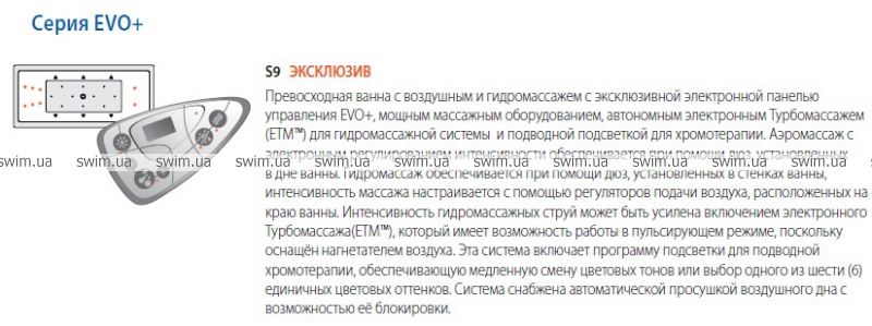 - Аеро- та гідромасажна ванна з електронним турбомасажем (ETM™) та панеллю управління EVO+