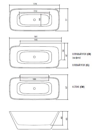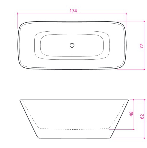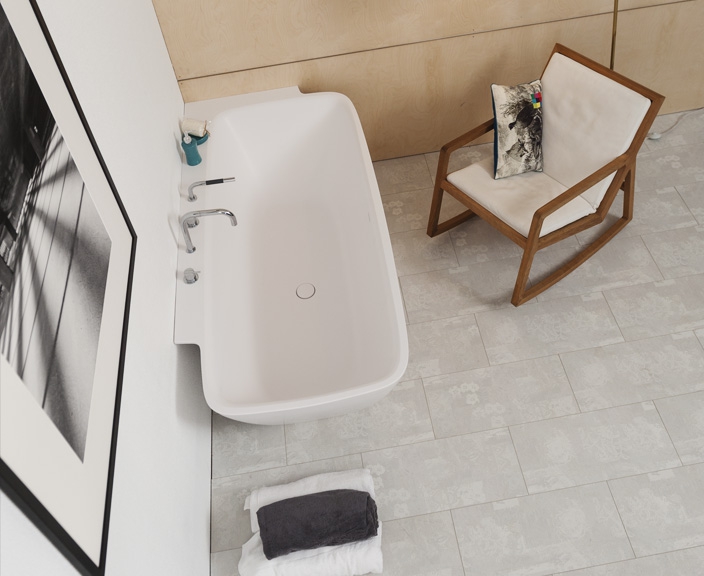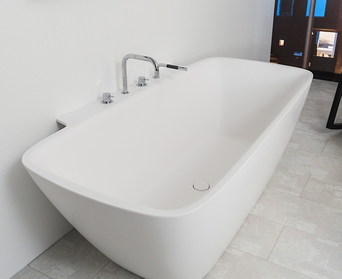 Ванна вместе с панелью изготовлена из каменной массы Xonyx™. Ванна и окружаемая её панель как единое целое, без видимых мест соединений. Ванна оборудована нажимаемым вверх/вниз сливом, колпак которого изготовлен также из каменной массы Xonyx™. У ванны имеется видимое отверстие под перелив, врезанное в корпус ванны.