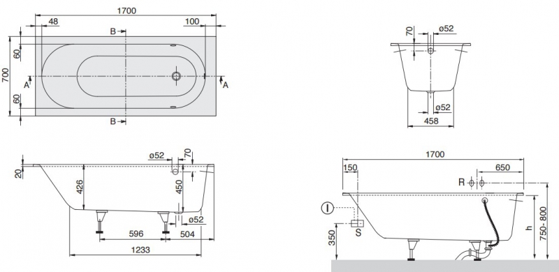 - Комплект ножек для ванны (самоклеящихся) входит в поставку, регулируются от 130 - 180 мм