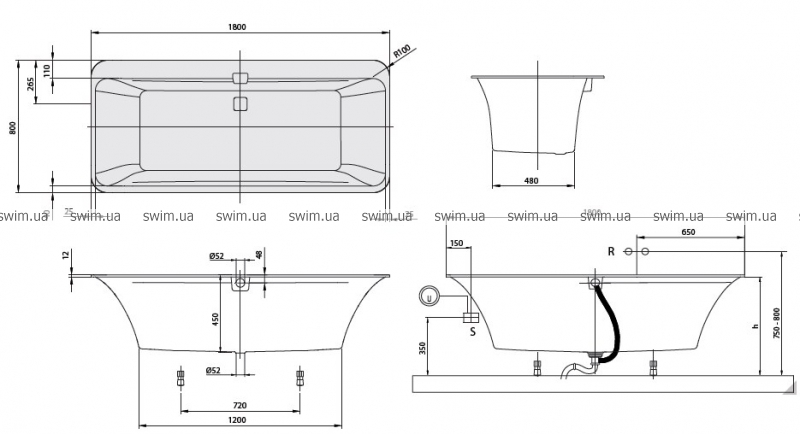 - Комплект ножек для ванны (самоклеящихся) входит в поставку, регулируются от 130 - 180 мм