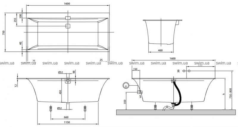 - Комплект ножек для ванны (самоклеящихся) входит в поставку, регулируются от 130 - 180 мм