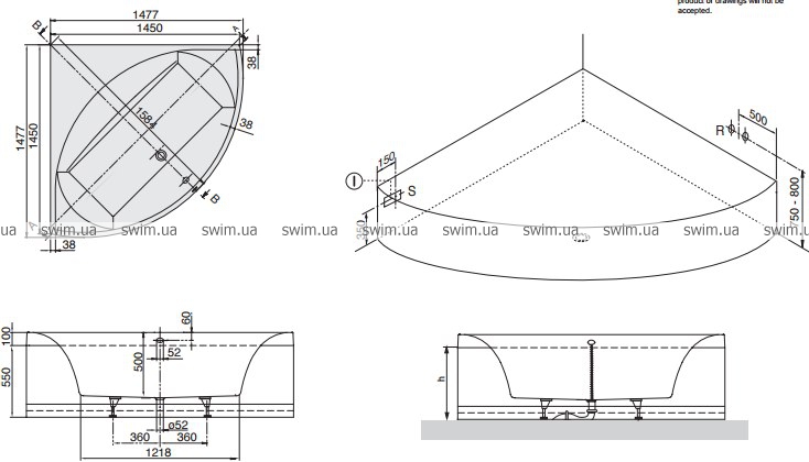• Комплект ножек для ванны (самоклеящихся) входит в поставку, регулируются от 130 - 180 мм