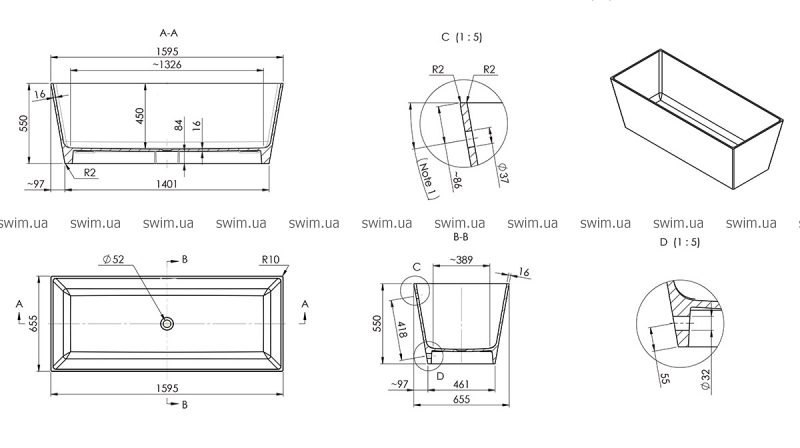 - Розміри: L: 1590 мм, W: 650 мм