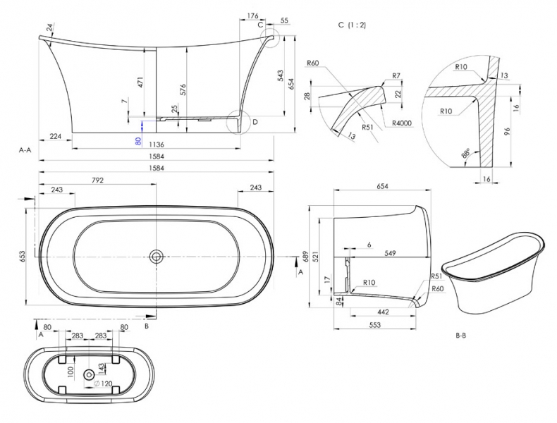 - Розміри: L: 1600 мм, W: 653 мм