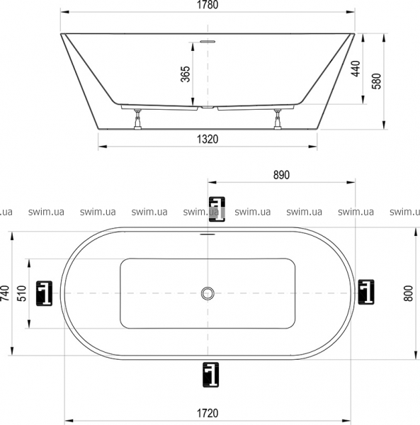 Ванна не может быть дополнена шторой для ванны. Распределение воды должно проводиться по полу как для слива, так и для водоснабжения для напольного смесителя. Сливной комплект для ванны (например, перелив, неподвижный слив, сифон, гидрозатвор и опора (ножки) входят в комплект. Для ванны также доступен напольный смеситель Chrome CR 080.00.