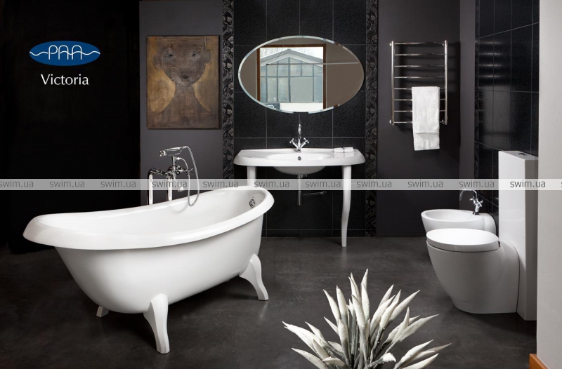 Вільна ванна. Будь-яка колекція для ванної кімнати повинна містити своє посвята Вікторіанській епосі. Пропозиція від PAA - це елегантна ванна Victoria на помпезних ніжках, які можуть бути виконані в кольорі ванни або в сучасному латиському стилі - з масиву ясена. Ванну Victoria можна замовити у будь-якому вибраному Вами тоні кольору. Широка палітра кольорів фабрики включає в себе однотонні і гранітні зразки. При виборі тону ванни можна скористатися будь-якою міжнародною палітрою фабрик, що виробляють фарби (RAL, Capparol і т.д.), або підібрати тон під плитку. Цікавою пропозицією фабрики є можливість виробництва двоколірних ванн – внутрішня чаша ванни в одному тоні, зовнішня – в іншому.