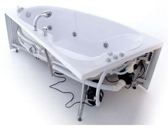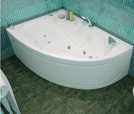Акрилова гідромасажна ванна "Ізабель". Дно з рифленою масажною поверхнею, широка спинка із зручним підголовником, встановлення змішувача, лицьовий екран.