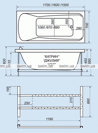 Акрилова гідромасажна ванна «Катрін». Практичність та витонченість дизайну - зробили цю ванну дуже популярною у покупців. Завдяки лаконічності та витриманості форм така ванна користується постійним попитом. Вона була розроблена спеціально для стандартних ванних кімнат.