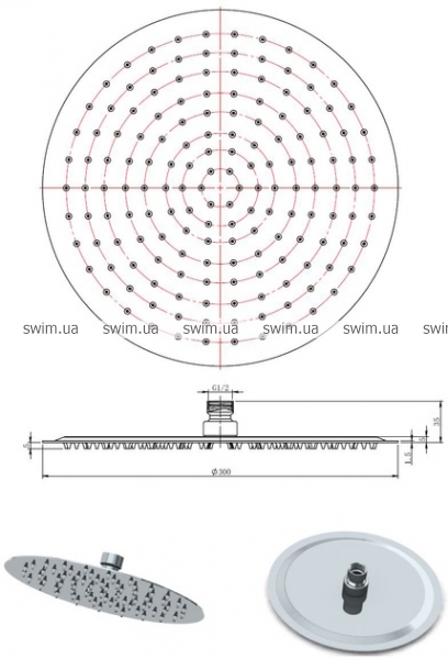Круглий верхній душ від Mixxen має діаметр душової поверхні 30 см, виконаний з високоякісної нержавіючої сталі з покриттям хромованого кольору, має один режим струменя і оснащується універсальним підключенням під діаметр 1/2".